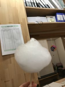 夜勤の日にデイスタッフから綿菓子いただき、甘く美味しかったです。ありがとうございます😊。