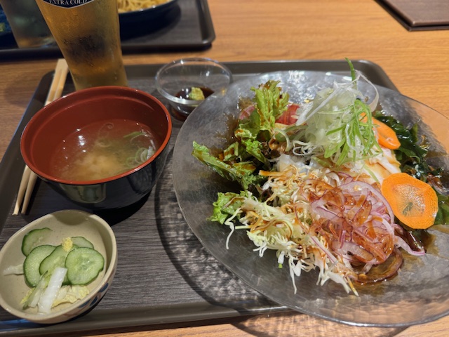 野菜に隠れて見えにくいけど、日高のタコツブ丼。美味しかった。