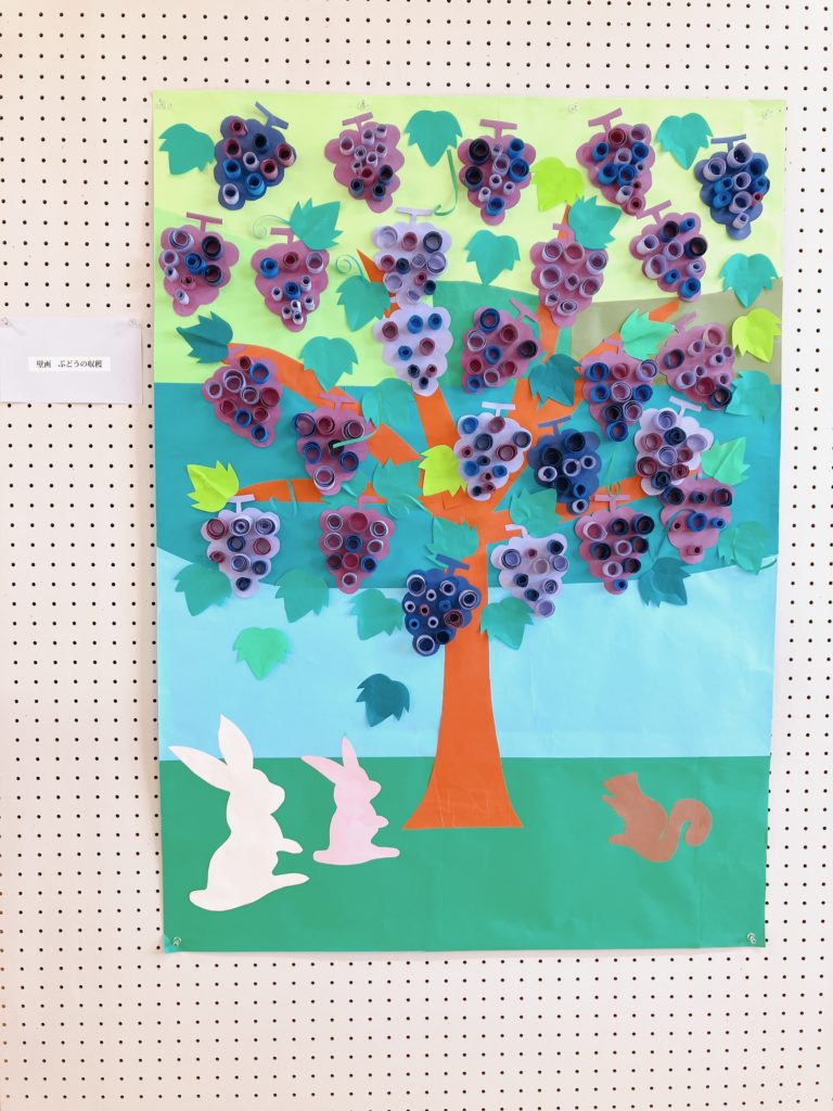 主に画用紙を使った作品で、細長く切った画用紙をくるくる丸めた実が特徴です。