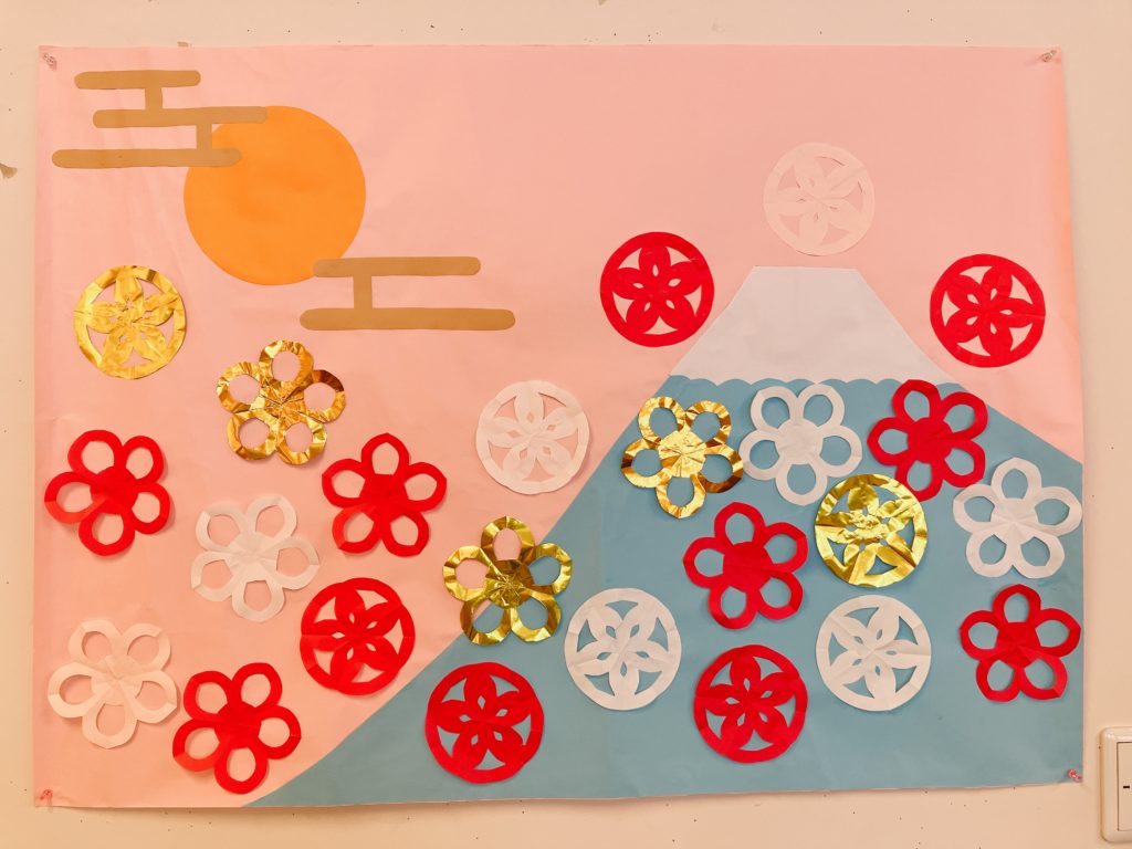 まずは、富士山と紅白梅の壁飾りです。久しぶりに模造紙を使った大きめの作品となりました!華やか!