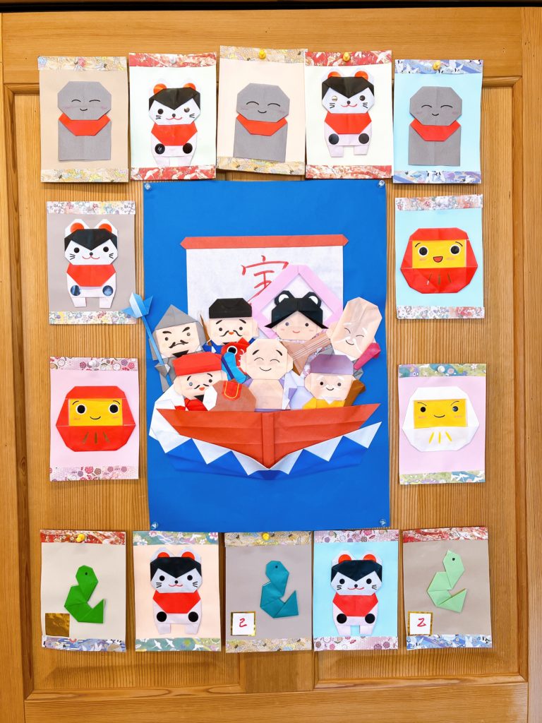 お地蔵様、犬張子、だるまからお好みの物を選んでいただき、台紙や装飾の折り紙の色も好きなものに貼っていただきました。