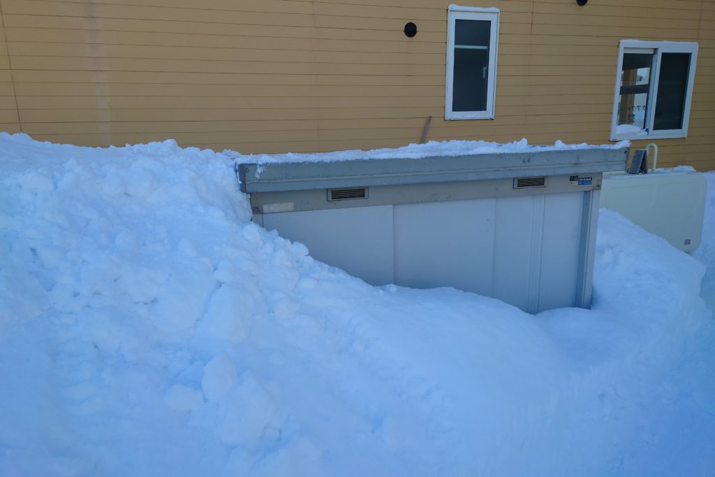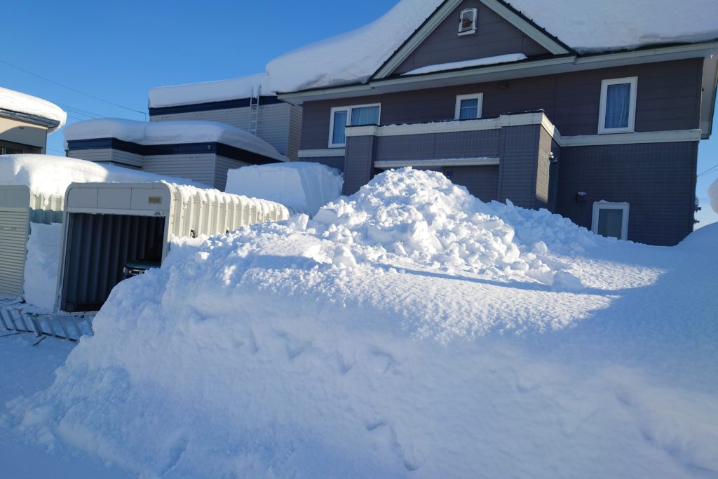 道路から玄関が見えないほど高く降り積もり、物置も雪で埋まり