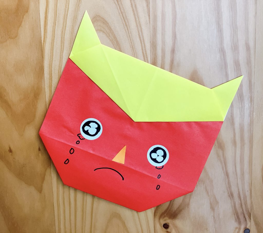 節分は、折り紙を使って赤鬼・青鬼を。