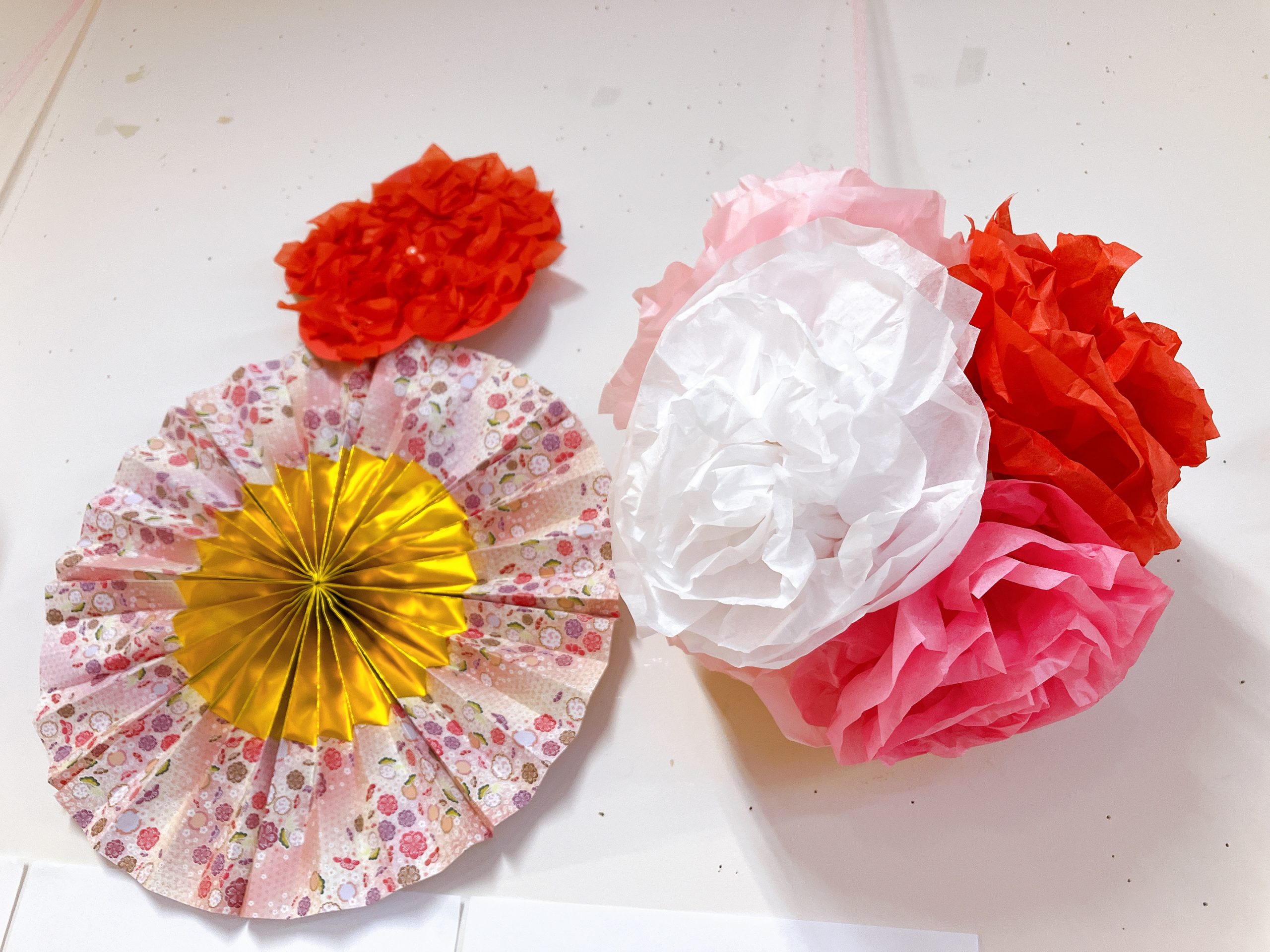 花の形に切った画用紙に、お花紙をひねって貼りつけて、フワッとした立体的な飾りに。