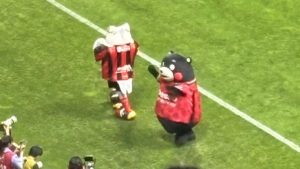ハーフタイムには熊本のマスコットキャラクターのくまモンとドーレくんが一緒に踊って