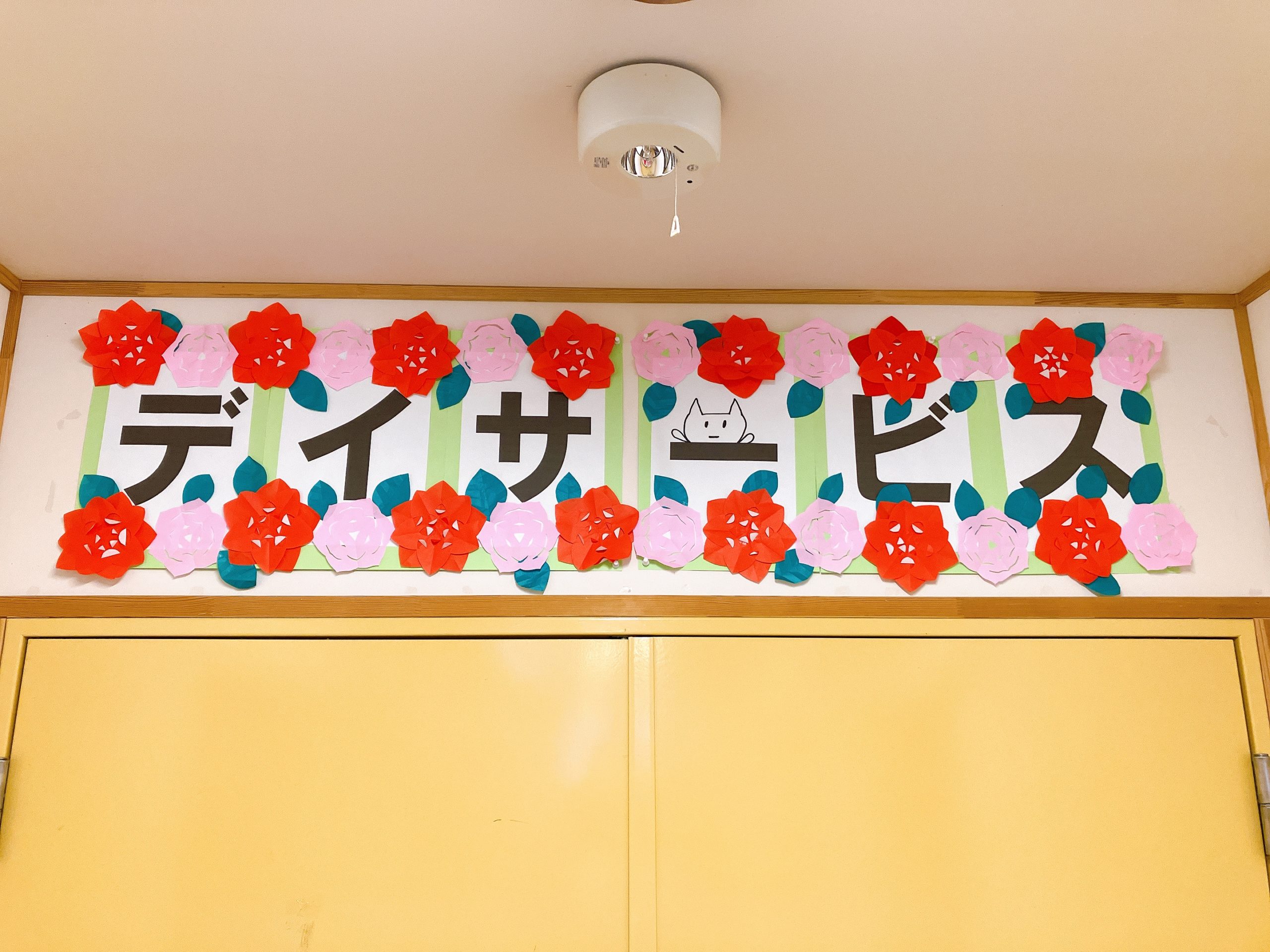 制作には、緑の画用紙に字を貼る係、薔薇や葉を切り出す係、薔薇を組み立てる係、看板に仕立てる係と、沢山の利用者様に手伝って頂いて、1ヶ月ほどかかった大作です。