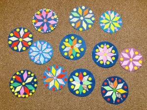 ブロック折り紙と丸いシールを、それぞれお好みの位置に配置して頂き、色とりどりな花火ができました。
