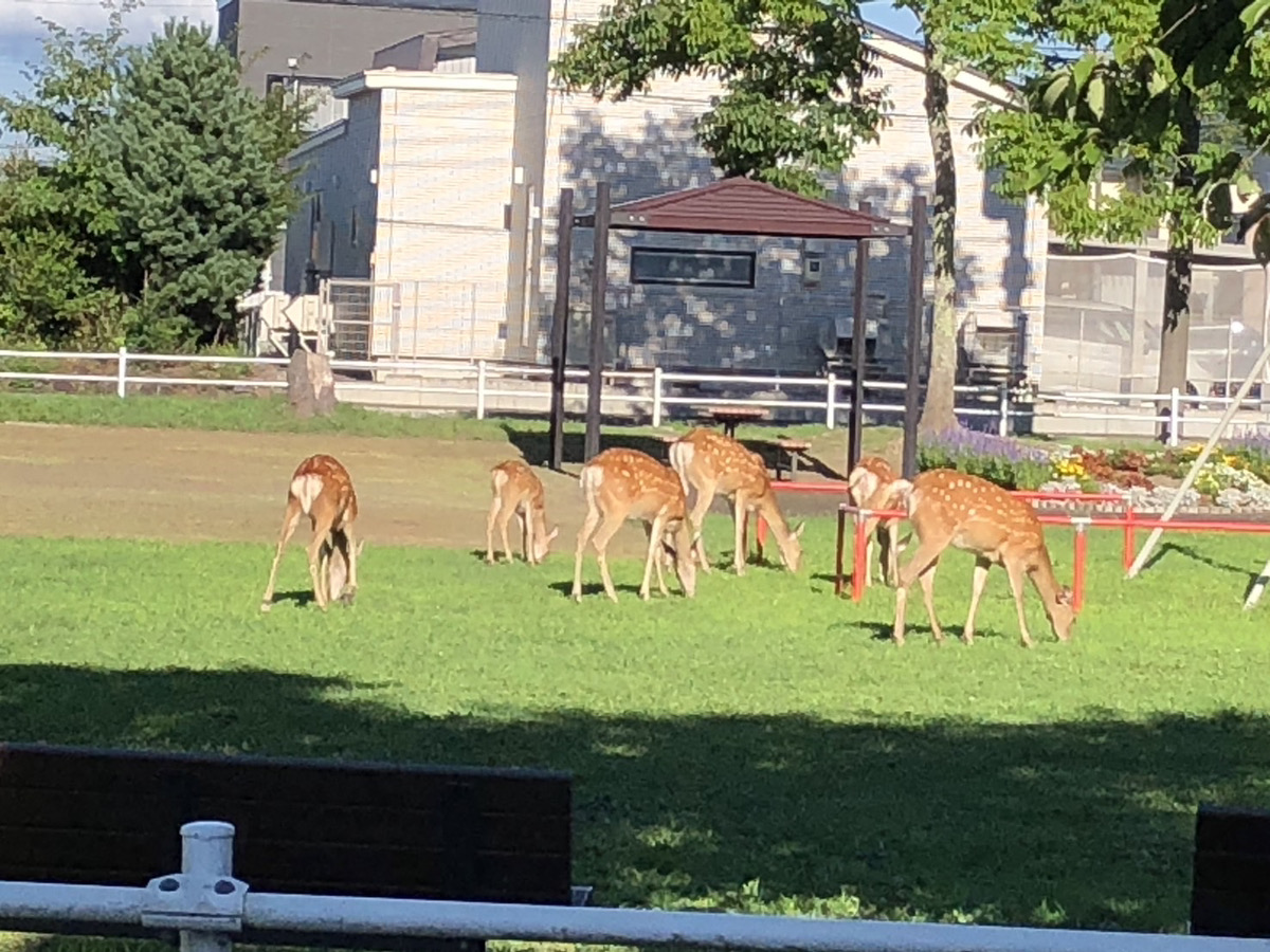 な、なんと すぐ前の公園に 沢山の鹿がいるではありませんか😱 ここは鹿公園かばりの数に びっくりしながら 見ていると 鹿の動きが止まり 目が合うこと 数秒…