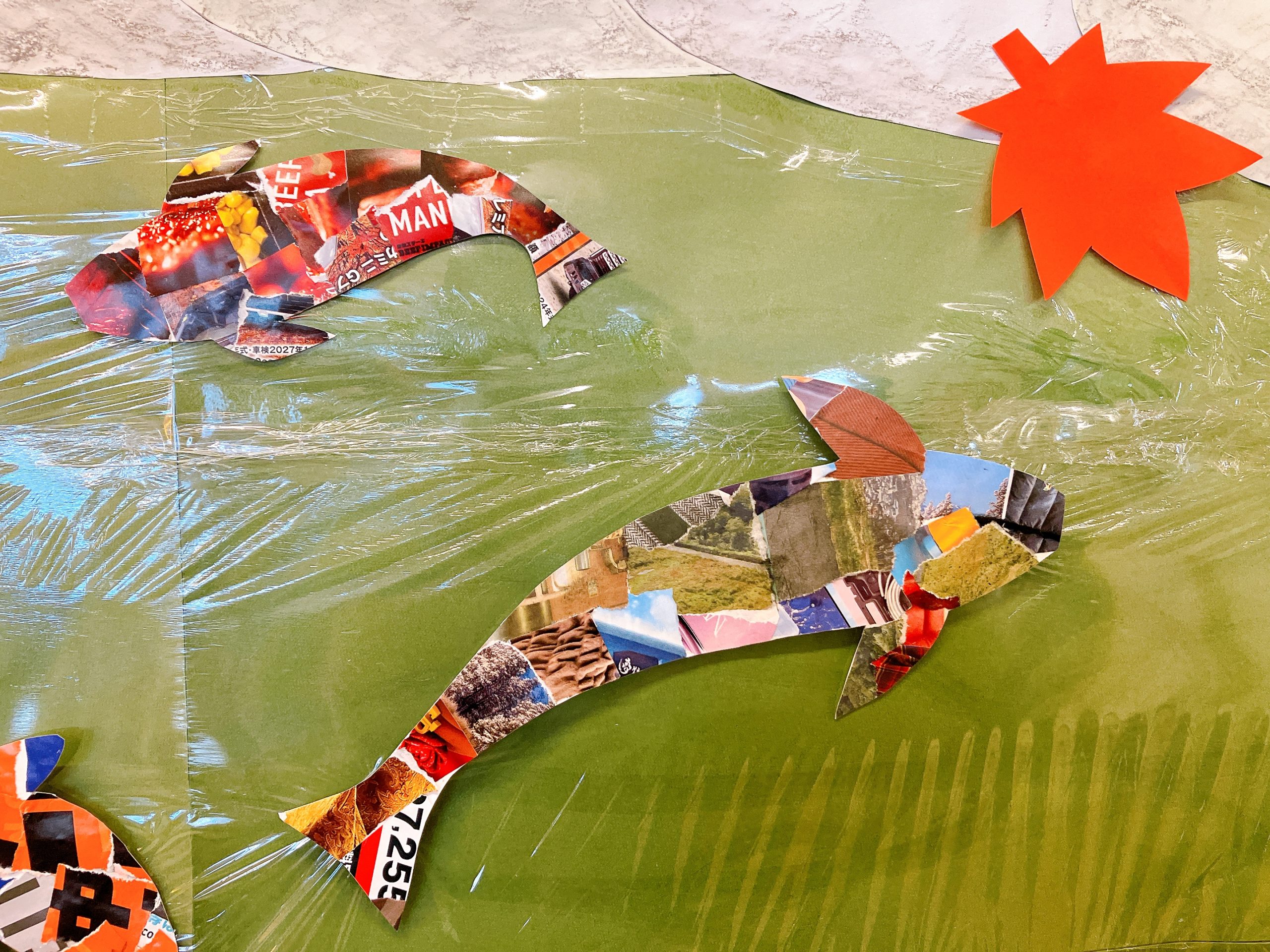 鯉がコラージュになっており、チラシをちぎったものを利用者様のお好みで貼っていただき、ハサミで切り出して魚の形にしています。