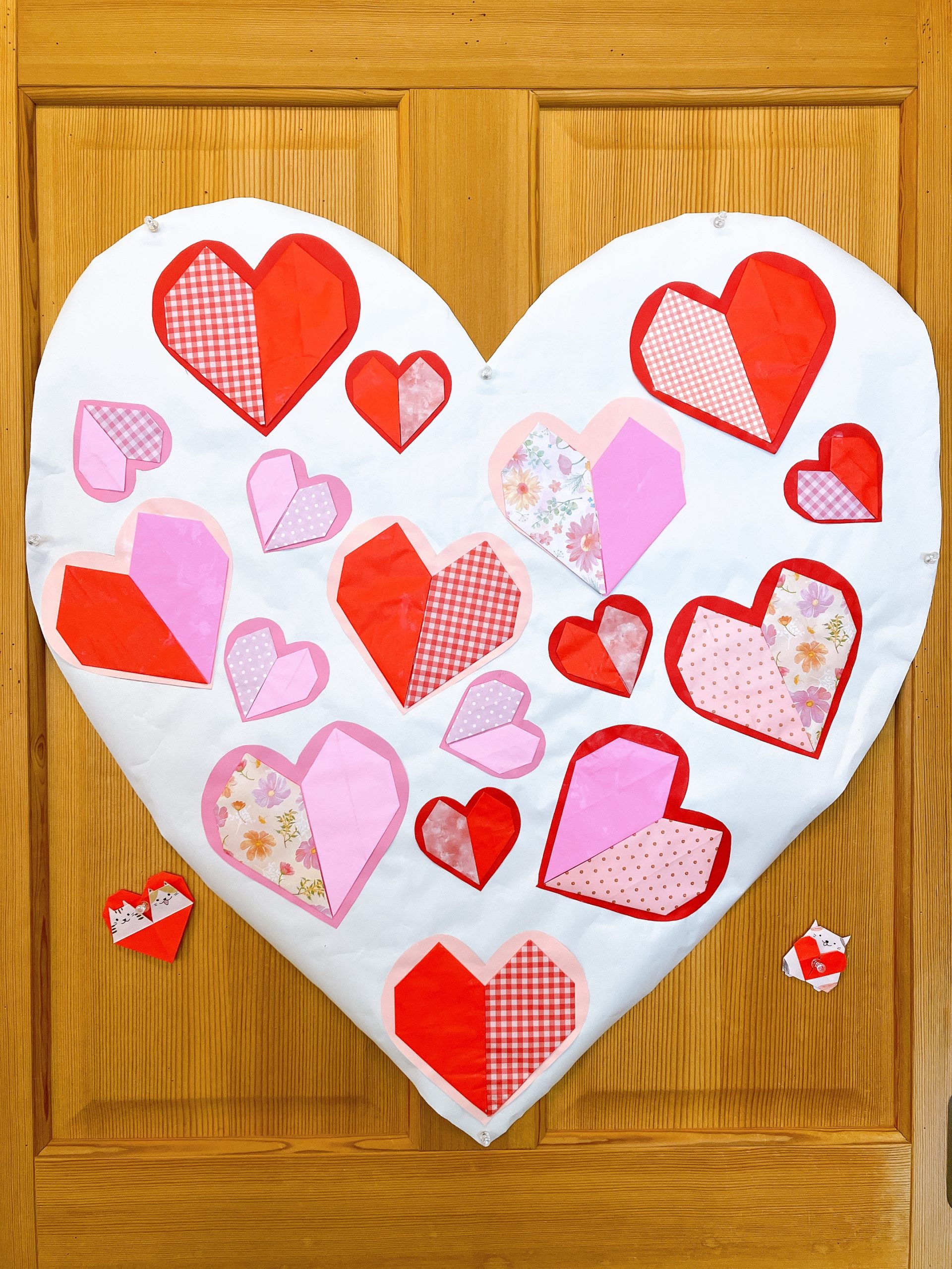 ブロック折り紙を利用して大小のハートを作り、1つの巨大なハートに仕立てました。