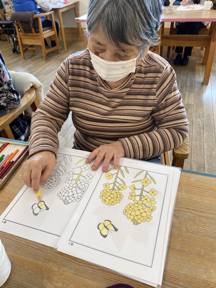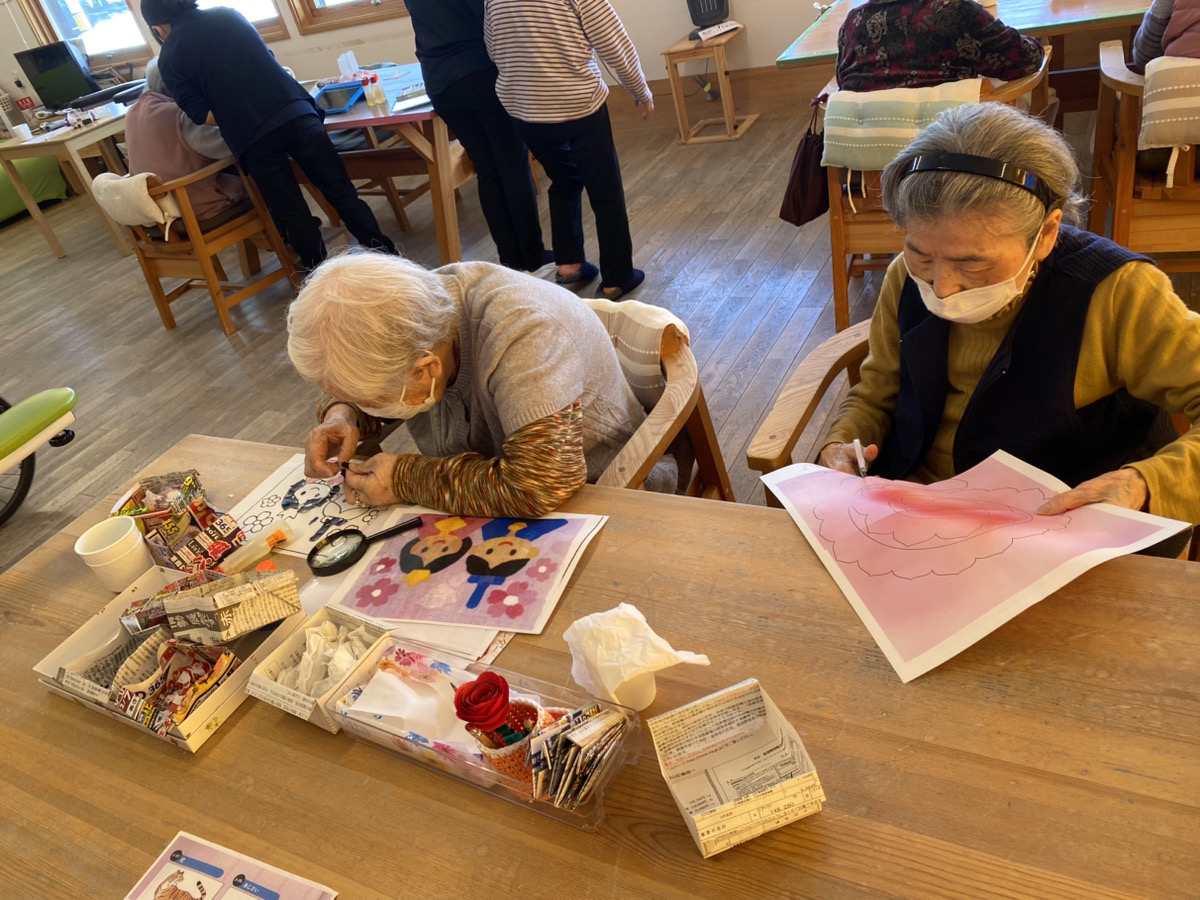 制作は春らしく、お花やひな人形。デイ内がピンク色黄色などカラフルになる日もちかいのでは?