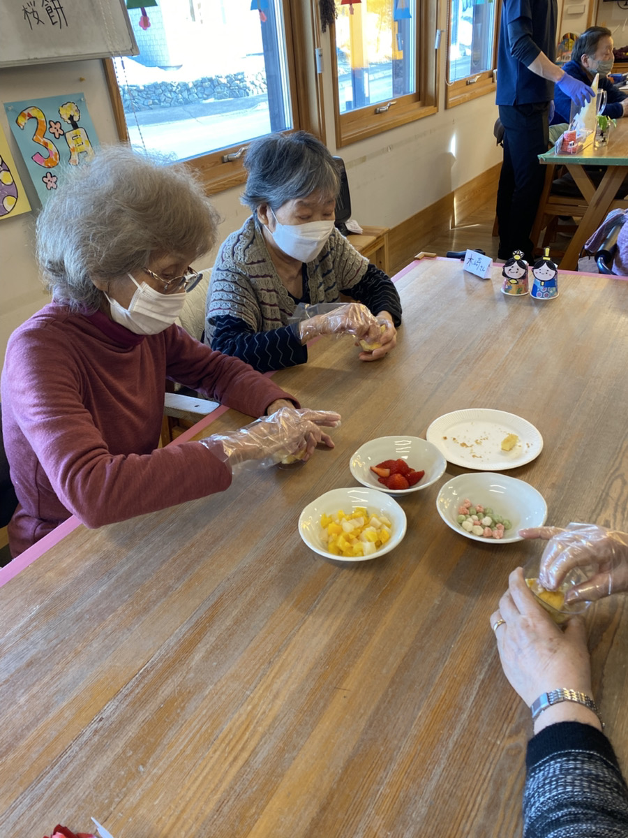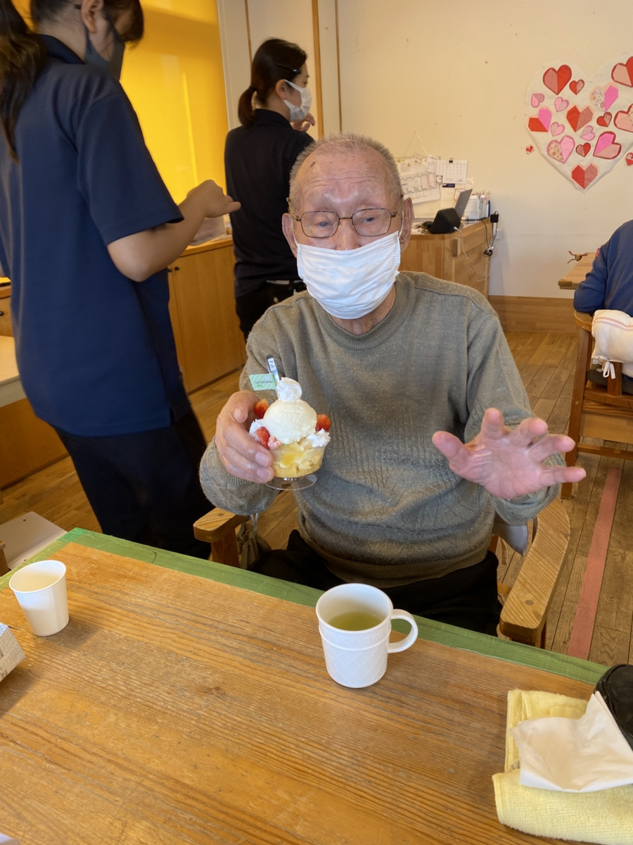 まずは、ひなまつり。今年はパフェ作りをしましたよ!いちごのいい香りがデイ内に漂っていました。クリームもアイスもご自身で盛り付ける量を選んでもらいました!