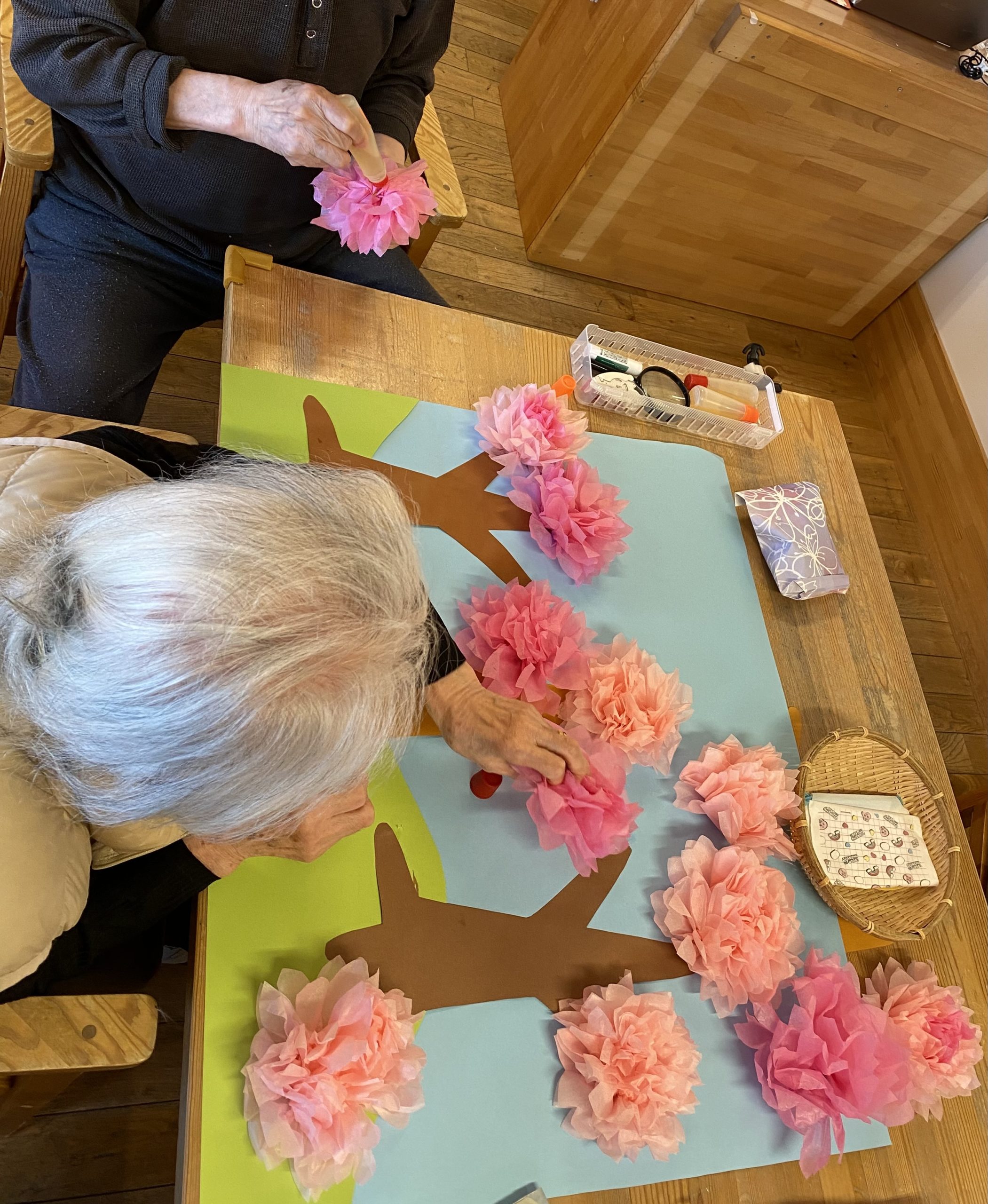 デイサービスでは認知機能訓練をかねて春の桜の制作を行いました。